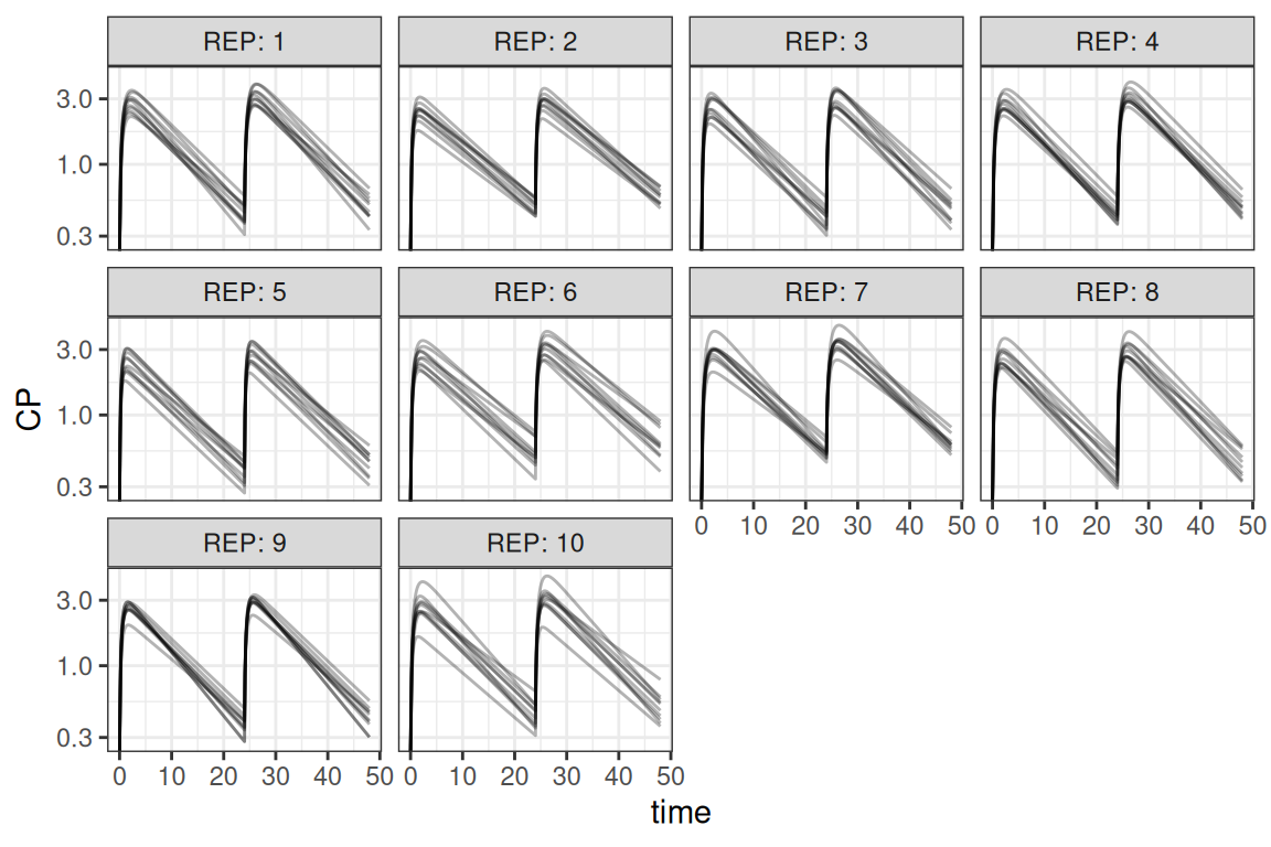 For larger clinical trial simulations it is often necessary to simulate including both IIV and uncertainty. This section describes a way to do so. Also running these types of simulation can be computationally intensive. To speed up the simulation an example is included that uses the parallel package, although various other frameworks could be used to multi-thread the simulations. This example combines the examples above where in this case 10 trials are simulated for 10 subjects each