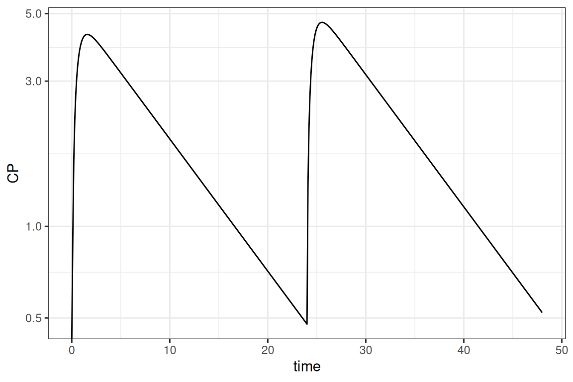 out <- mdose(Dose = 10, tau = 24, ndose = 1, t = times,