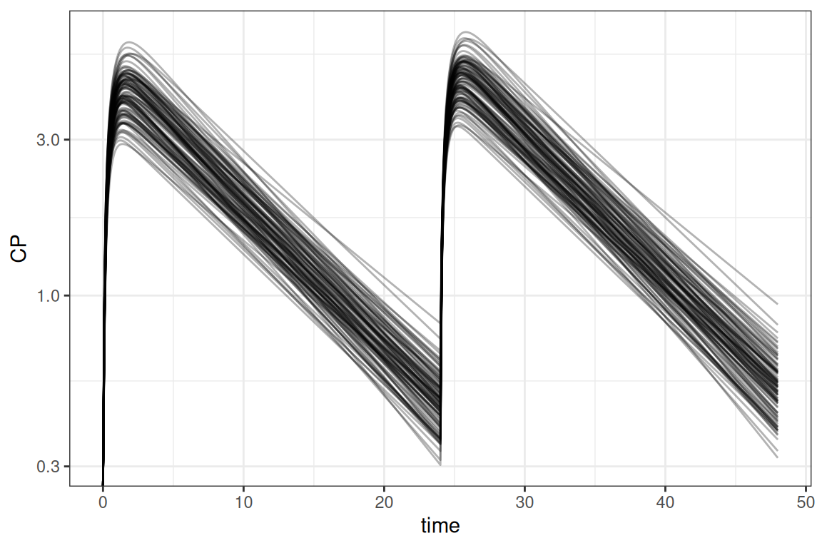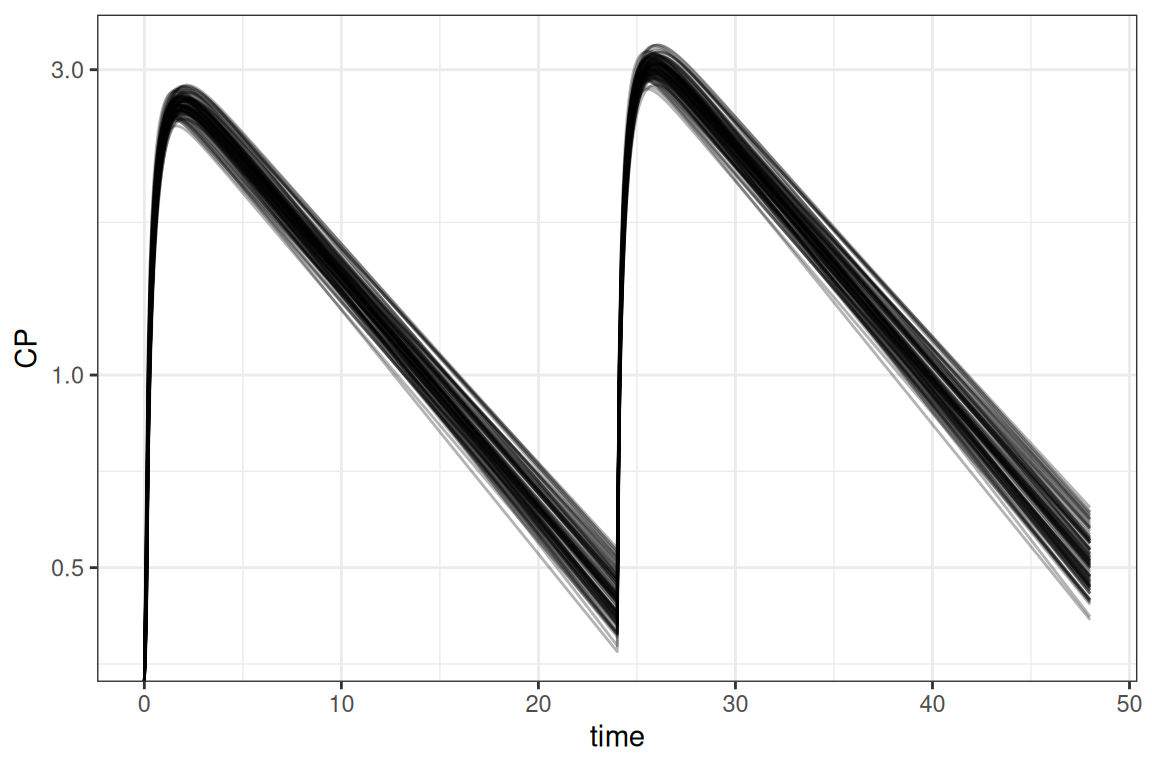 In the example above, the values are sampled within the model. It is also possible to perform all sampling within R using the sample_par function. In case a clinical trial simulation should be done using a combination of replicates and subjects, it is more convenient to use the sample_sim function instead. This function is a wrapper around sample_par but makes it easier to make a combined sampling dataset of replicates and subjects.